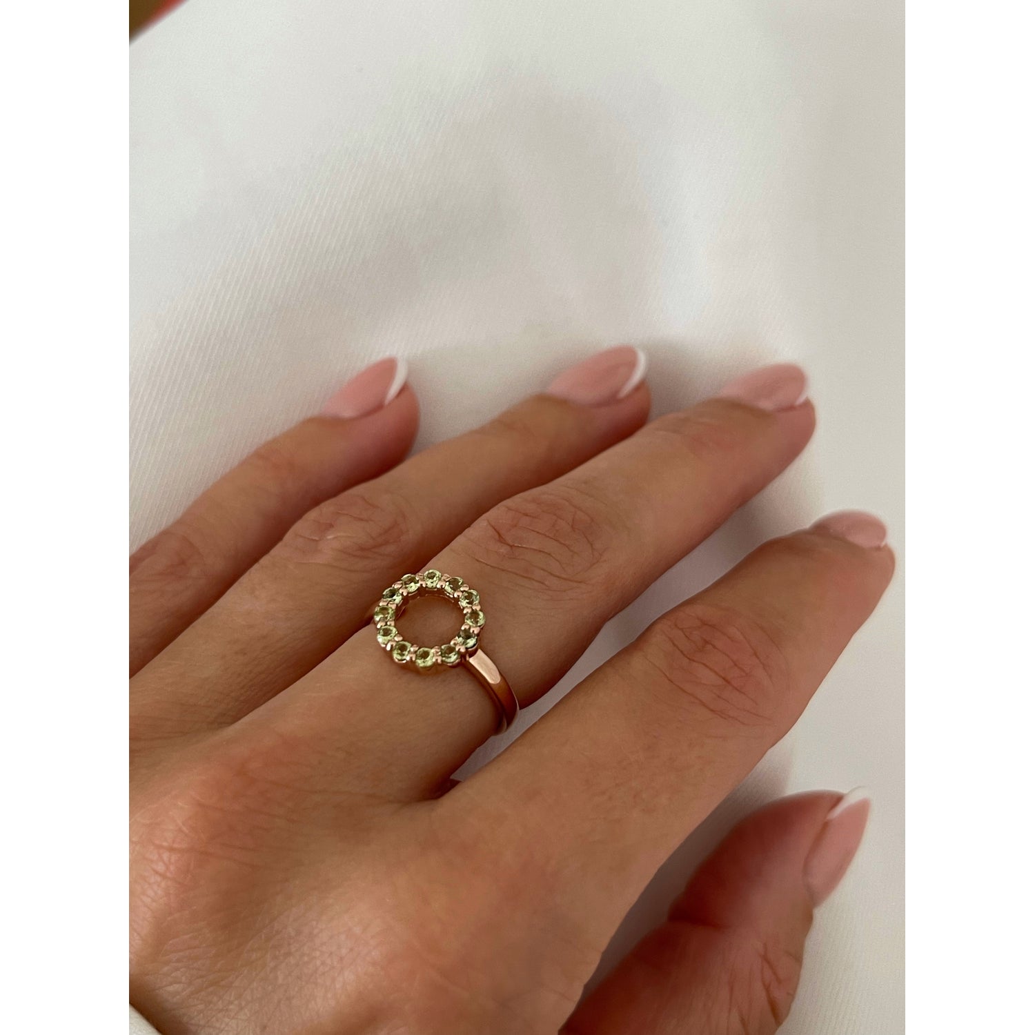 Meet the Aleksandra ring — a modern classic featuring a continuous circle of sparkling Peridot, the traditional birthstone for August. This beautiful piece is a timeless symbol of protection (against negative energy) and prosperity. Expertly crafted in 14k Yellow, White, or Rose Gold, it's designed to be the perfect foundation for your ring stack.