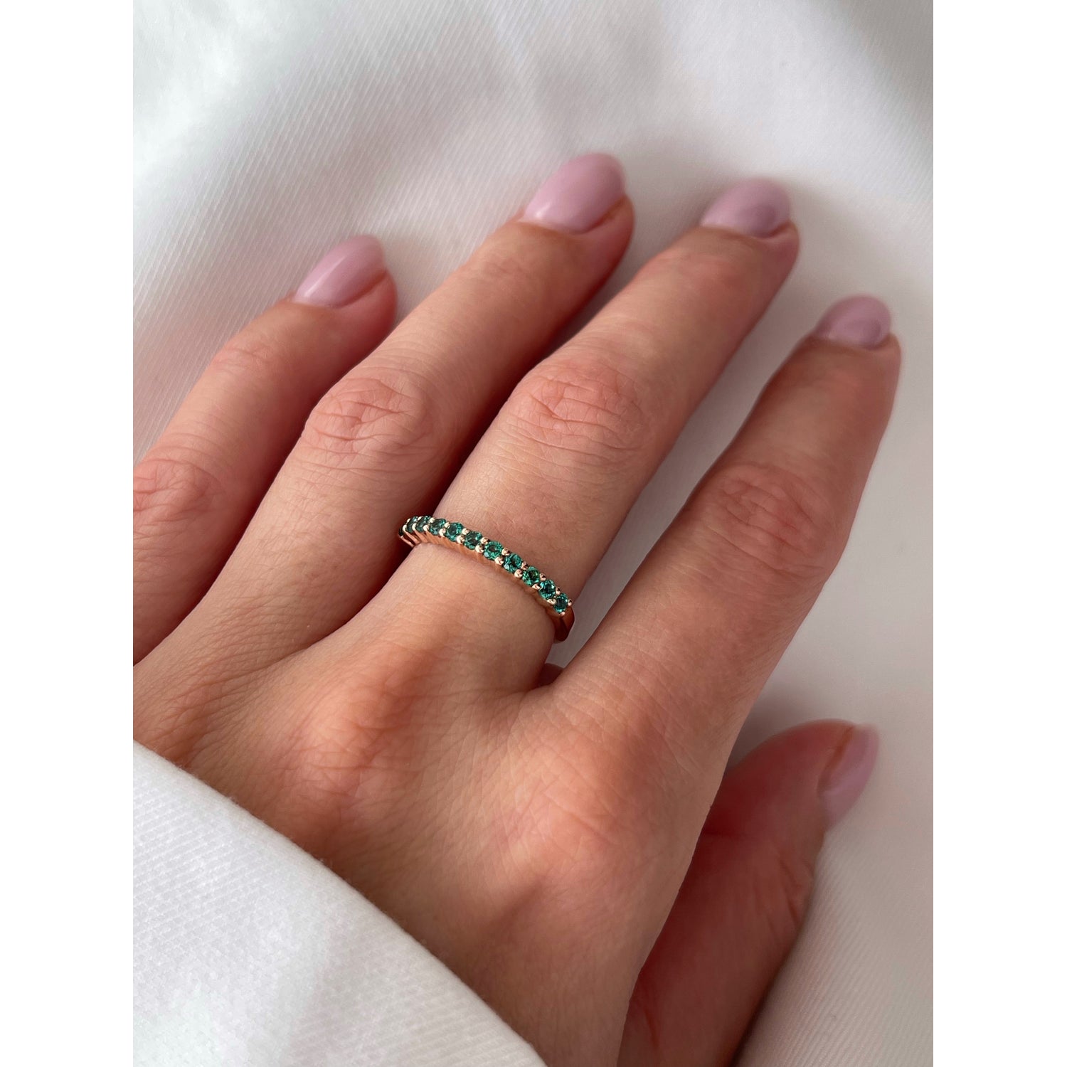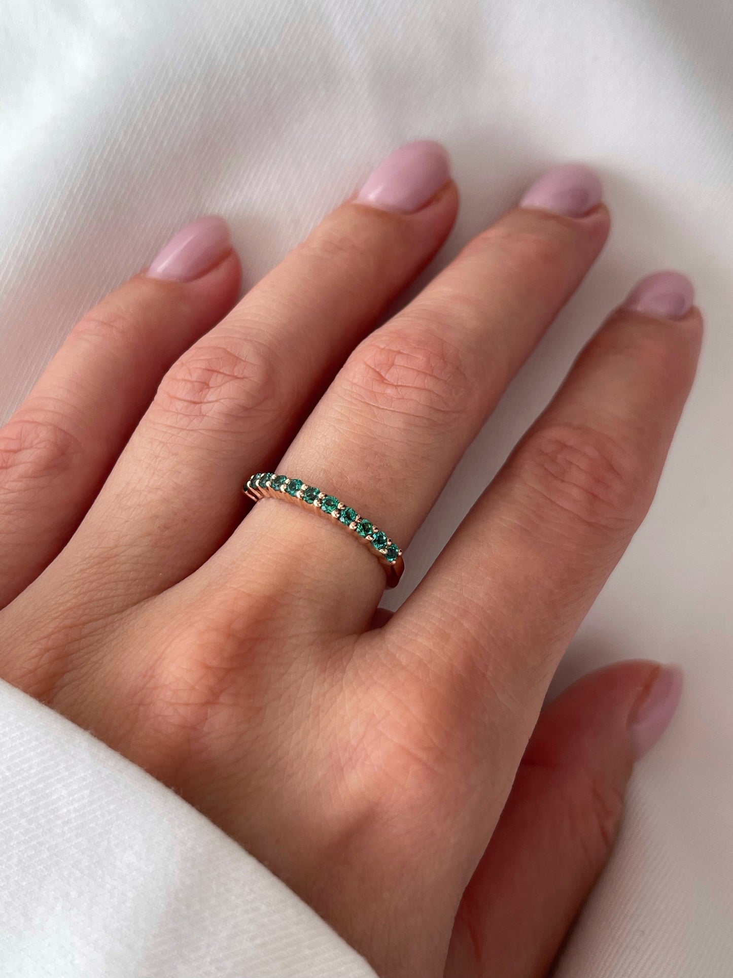 A simple design with deep meaning. The Ariana band ring features the vibrant Emerald — the birthstone for May — and a universal symbol of faithful love and renewal. Expertly set in 14k Yellow, White, or Rose Gold, this ring is a meaningful birthstone gift that she can wear daily, whether stacked or solo.