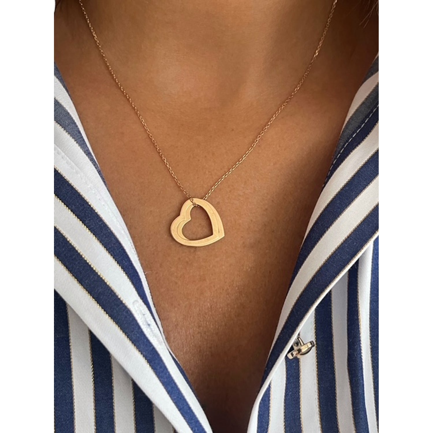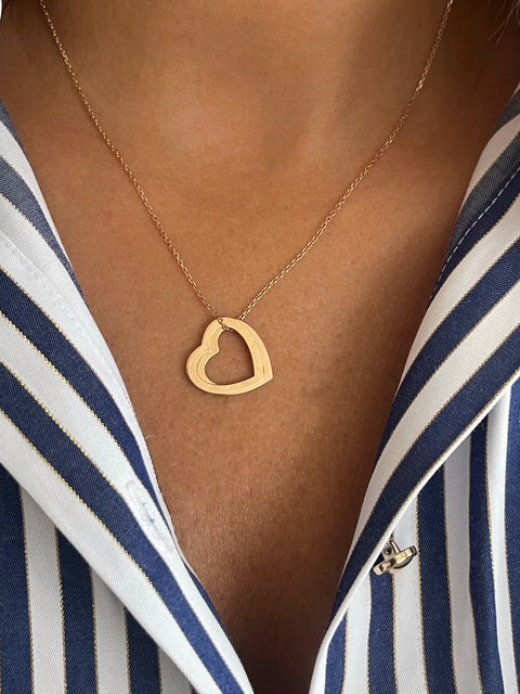 Meet the Hollow Heart Necklace. This stunning piece features a delicate stack of 2 hollow heart pendants. The nested design beautifully represents heart-to-heart connections and the unbreakable bond shared with the people. Expertly crafted in 14k Yellow, White, or Rose Gold, it's a lightweight, deeply meaningful piece she will love wearing. Make it truly personal with engraving on the back for a name or initials.
