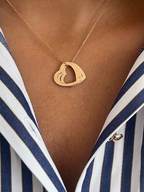 Meet the Hollow Heart Necklace. This stunning piece features a delicate stack of 3 hollow heart pendants. The nested design beautifully represents heart-to-heart connections and the unbreakable bond shared with the people. Expertly crafted in 14k Yellow, White, or Rose Gold, it's a lightweight, deeply meaningful piece she will love wearing. Make it truly personal with engraving on the back for a name or initials.