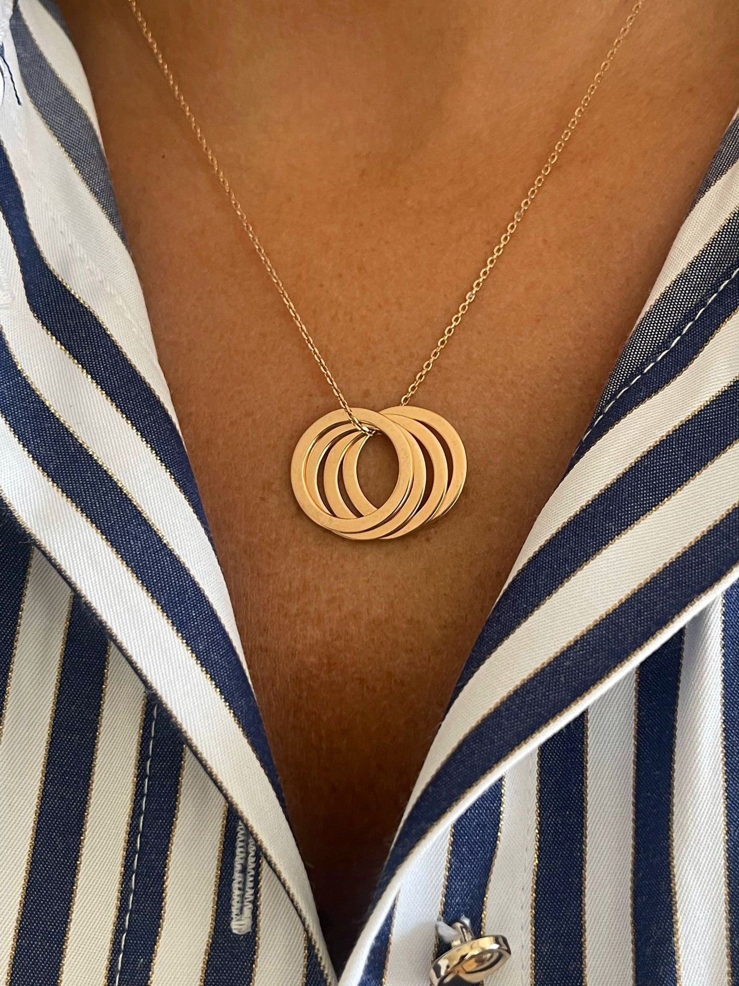 Meet the Interlocking 4 Circle Necklace, a minimalistic yet stunning piece that beautifully represents an enduring bond, a milestone, or a loved one. Expertly crafted in radiant 14k Yellow, White, or Rose Gold, this necklace can be custom-engraved with initials or names. It’s a deeply sentimental treasure, perfect for celebrating the unbreakable ties she holds most dear.