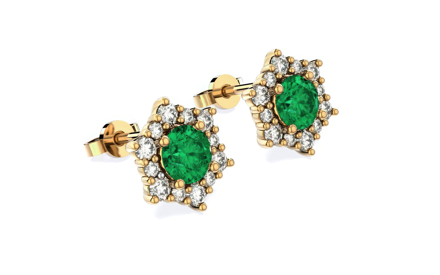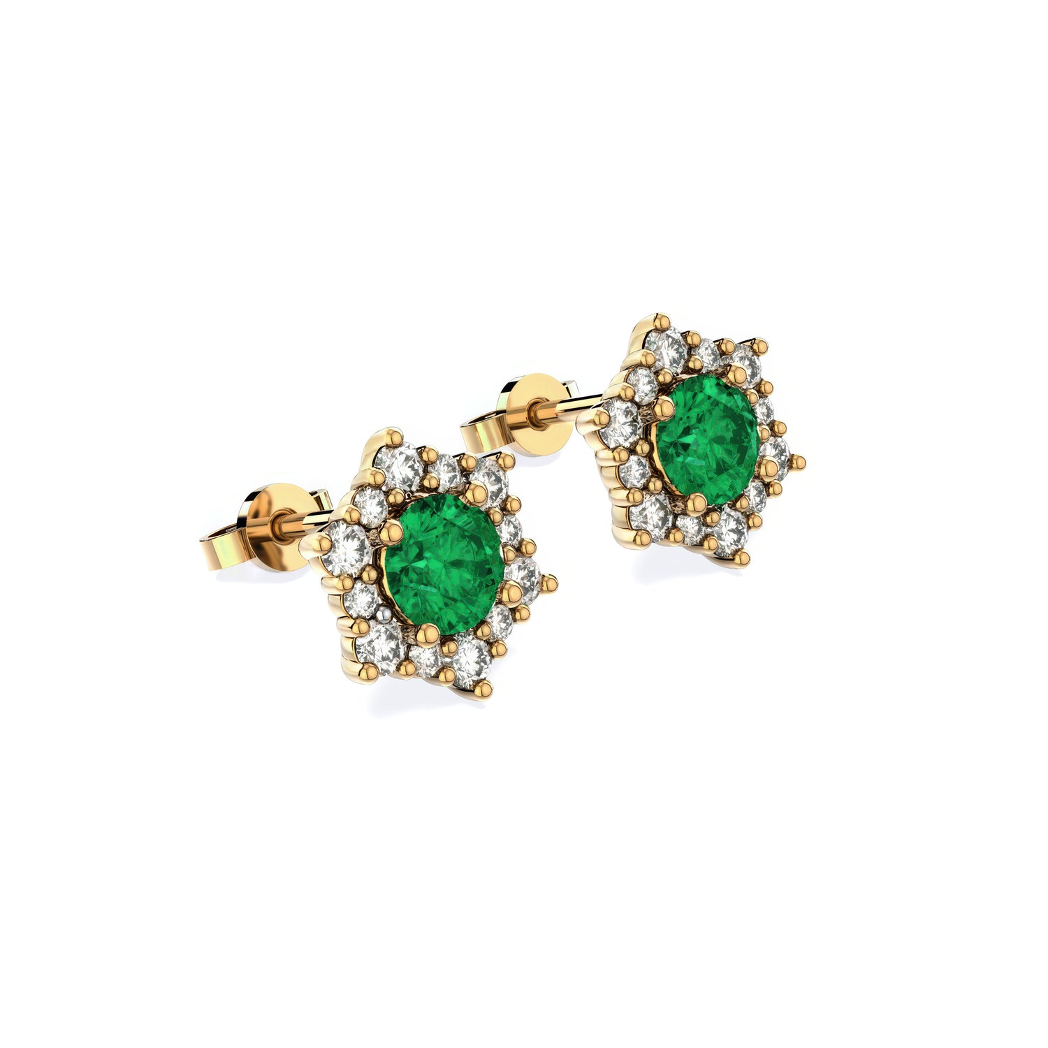 • Each earring features one sustainably grown emerald birthstone encircled by twelve sustainably grown round diamonds.