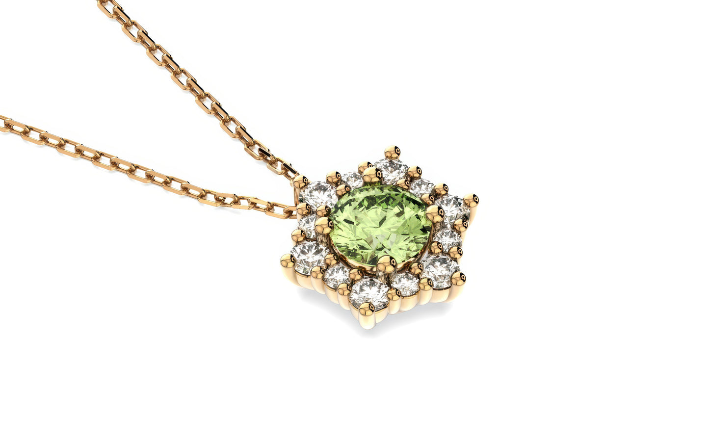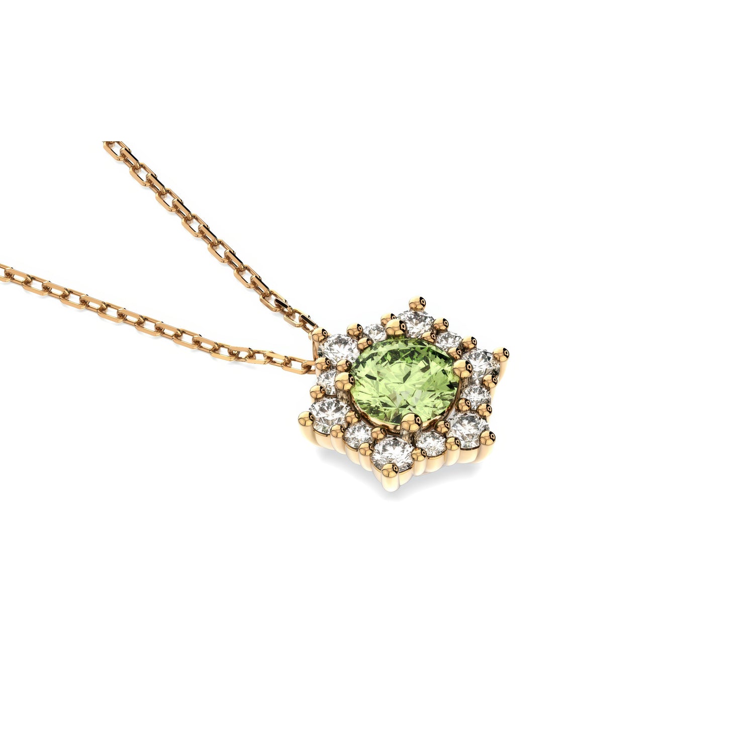 Prepare to shine in the Valentina necklace. The magic of this piece lies in its centerpiece — a luminous Peridot, August’s birthstone and the stone of protection (against negative energy) and prosperity. Framed by a halo of shimmering diamonds, it captures the look and brilliance of a much larger solitaire. Expertly set in 14k Yellow, White, or Rose Gold, it's the perfect piece – striking enough to stand on its own, yet refined enough to layer with your other minimalistic necklaces.