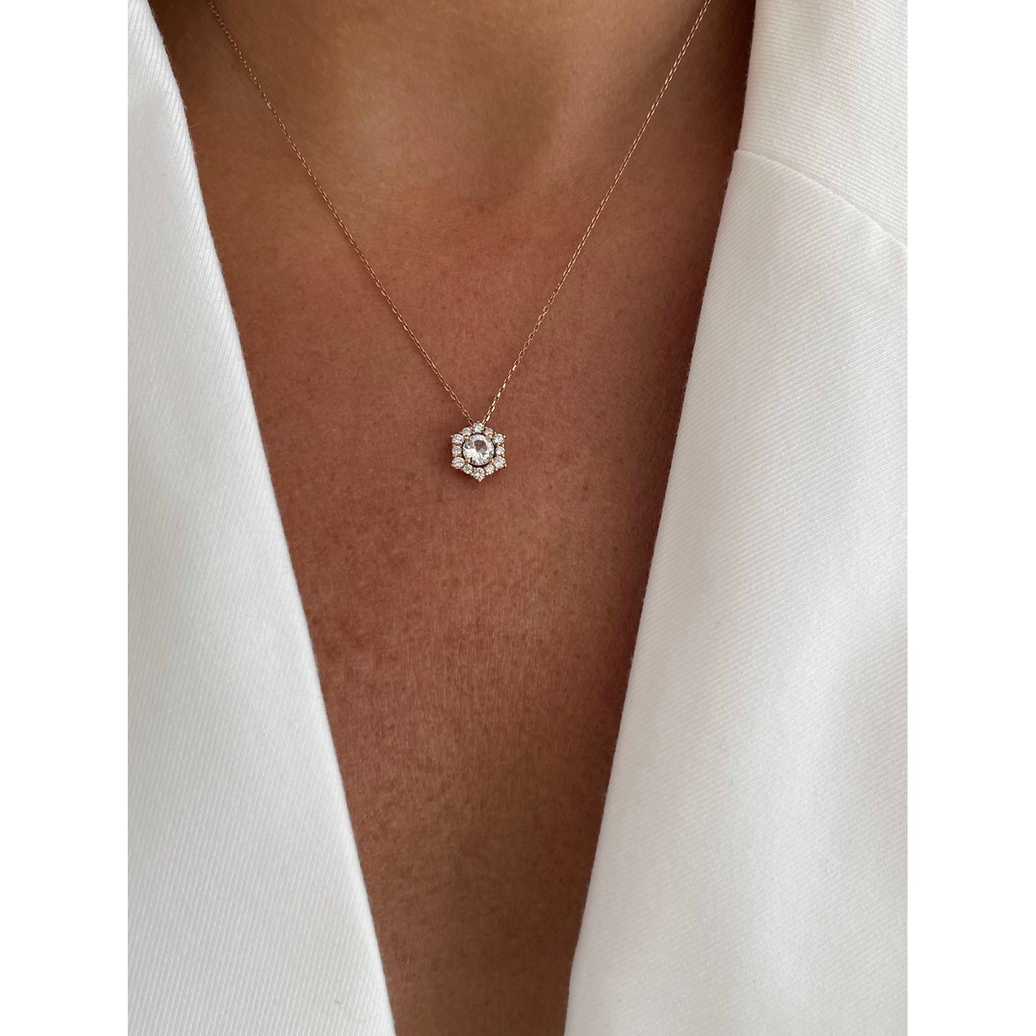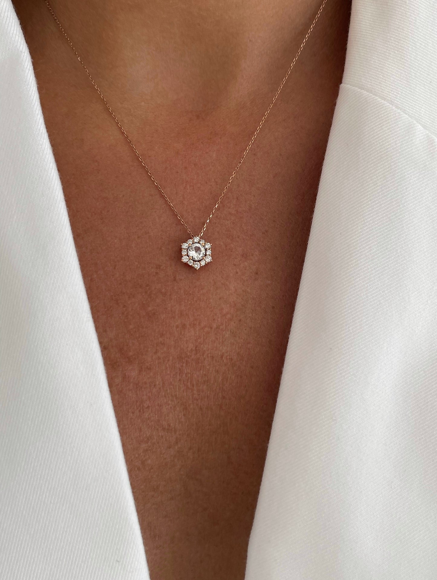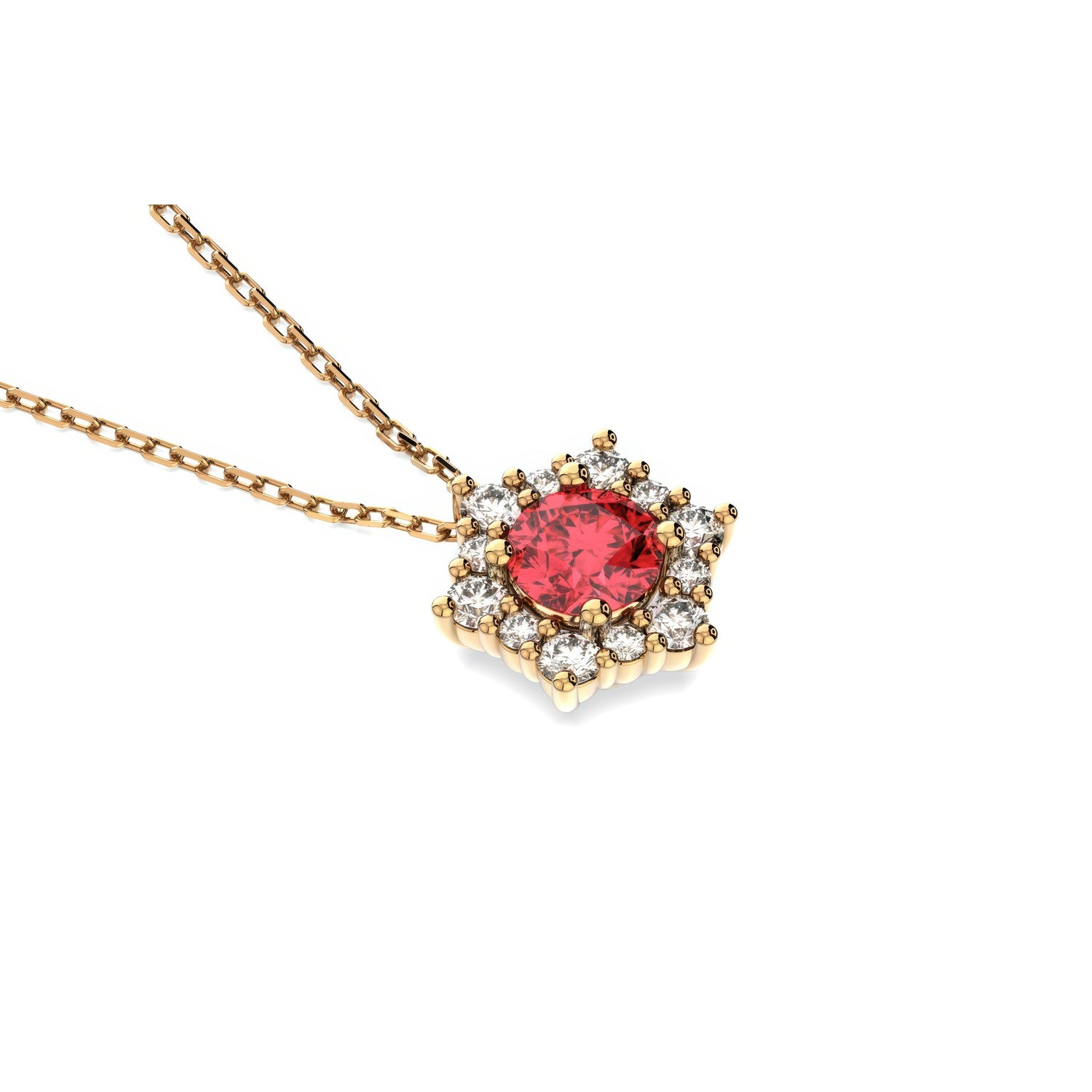 Prepare to shine in the Valentina necklace. The magic of this piece lies in its centerpiece — a luminous Ruby, July’s birthstone and the stone of vitality and wealth accumulation. Framed by a halo of shimmering diamonds, it captures the look and brilliance of a much larger solitaire. Expertly set in 14k Yellow, White, or Rose Gold, it's the perfect piece – striking enough to stand on its own, yet refined enough to layer with your other minimalistic necklaces.